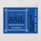 Vintage och retro stil för detta anpassningsbara 85-årsfirande Spara datum postkort i blått med en halvtransparent ram. Matchande anpassningsbar pappersservett och pappers tallrik, fästbok för födelsedagsgäster (spiralhäfte, hårt omslag och pärm), presentetikett och andra produkter... Andra modeller med vit ram och svart ram finns tillgängliga.