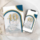 Dessa minimalistiska retro-inbjudningar för 40-årsfirande är perfekta för en födelsedagsfest. Inbjudningarna har ett retrotema med nyanser av blått och guld. En modern mall för födelsedagsinbjudan med din foto omgiven av valv i moderna blå och gyllene toner. Teckensnittsstilar och färg kan ändras genom att klicka på länken Anpassa ytterligare efter anpassning.