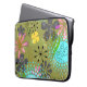Neoprenesleeven för din bärbar dator- eller anteckningsbokdator har ett hippiemönster med retro blommor, cirklar och virvlar runt i turkos, gult, rosor och kolgrått på en oliv grönt bakgrund. Klicka på "skräddarsy den!", att att personifiera med din egna namn eller text. Tillgängligt i 3 storleksanpassar. För © vingefotografi & design lite
