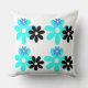 Make a bold statement with our "Retro Bloom Duo - Bold Contrast" pillow design. This eye-catching pattern features four dynamic clusters of stylized flowers, each centered around a large, vibrant turquoise bloom. These are strikingly contrasted by two smaller flowers in deep black and bright blue, creating a modern and energetic visual. The clean, graphic style gives it a distinct retro flair, while the strong color combination ensures it will be a captivating focal point in any contemporary or eclectic setting.