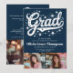 Fira student med den här djärva studentfesten inbjudan! Med en marin blå bakgrund i mörken, ett lekfullt glatt stjärnskript med "Grad" och tre personliga fotofack fångar den här designen upp en roligt och en energisk bild. Baksidan fortsätter vintagens estetik, en studentmössa grafik och utrymme för extra-detaljer. Perfekt för student som kärlek är nostalgiskt men trendiget ser ut!