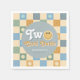 This groovy boys 2nd birthday napkin design captures 70s vibes with a blue pastel chequered border, and includes space for a name. Perfect for a cute "Two cool dude" boho birthday, this playful blue smile design adds charm to your little one's special day!