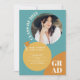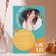 Cirkel upp och fira! Vår moderna elegant-boho-inbjudan är perfektens sätt att tillkännage studenten i stil med ett fet typsnitt med redigerbart retro-teal blue, senapsans terracotta och cirkelformer, lägg till fem av dina favoritfoton. inbjudan din gäst till ditt öppna hus och meddela studenten i stil.