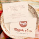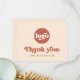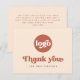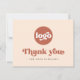Företagskort med texten "Tack" i ett stil-teckensnitt. Terracotta brun text (eller anpassningsbar färg) på en ljusare bakgrund. Ladda upp logotypen längst fram och lägg till anpassningsbar på baksidan. Du kan byta färg, flytta och ändra storlek på inslag med designen verktyg.