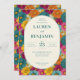 This is a floral style image featuring an elegant wedding invitation surrounded by a vibrant array of colorful flowers. The background bursts with shades of pink, orange, yellow, and teal, creating a lively and cheerful atmosphere. At the center, an oval frame in soft green holds all the essential details about Lauren and Benjamin's special day, including the date, time, and location. The overall mood is warm and inviting, perfect for setting the tone for a joyous celebration filled with love and happiness.
