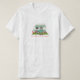 En t-skjorta som presenterar en illustration av ett retro släphem med turkosranden och markis och tre rosa plast- flamingos i gården. Hem- anpassadetextnågot att säga "är var du sätter dina Flamingos!",