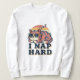 A cozy women’s sweatshirt featuring a retro cat celebrating nap culture.