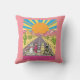Throw pillow in an illustration of five stylishly dressed cats wearing sunglasses ride in a pink convertible through a vibrant desert landscape. The backdrop features cacti, mountains, and a radiant, setting sun. The whimsical, pop-art style evokes a playful, retro road trip vibe.