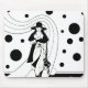 Vintage-illustration art deco-design med en chic kvinna iklädd hatt och kappa och bärandes en handväska. Kvinnan går längs en flytande stig. Svarta prickar, cirklar eller bubblor svävar runt omkring.