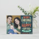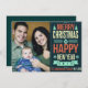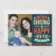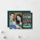 Rustik retro chalkboard stil mörk grönt bakgrund och ljusa retrotypografi med anpassningsbarnas årsnummer och namn i familjen . Lägg till ditt favoritfoto eller ditt husdjurs eller baby först helgdag bild... och anpassa sedan texten. Modern och glad väg att skicka semesterhälsningar i lycklig till alla dina vänner och nära och kära med högtidlig vintage. Kan användas för nyårs- och julfestinbjudan, personlig hälsning, korporativ hälsning.