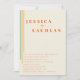 Öka bröllop med vår inbjudan till contemporary, med en ljusbakgrund och ett unikt reflexljus. Den här snyggten är utformad för tre påfallande rand på den lämnat i teal, gult och orange. Parets namn är elegant skrivet i orange, vilket framhävs av gulten "+" som symboliserar enighet och kärlek. Baksidan av inbjudan skryter med ett sjudande teal färg, som garanterar en modern men nostalgisk beröring. Perfekt för par som vill ha en blandning av modern elegans och vintage charm för sin speciella dag.