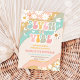 Fira ditt barns speciella dag med denna groovy retro födelsedagsinbjudan med färgglada vågiga ränder, glada tusenskönor, fredstecken, hjärtan, stjärnor, fjärilar och en leende sol. Perfekt för en 7-års födelsedagsfest, denna livfulla design fångar den roliga andan från 70-talet med en modern twist. Gästerna kommer att älska den lekfulla känslan och de fantasifulla detaljerna, vilket gör den idealisk för retro-, hippie- eller regnbågsinspirerade fester. Anpassa enkelt med dina festdetaljer för att skapa en unik inbjudan som sätter tonen för fred, kärlek och kul.