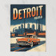 En reflekterad reseaffisch för Detroit, Michigan, är utrustad med en orange klassisk bil som kör på en väg mot ett cityscape med industriellt byggnad och fabriker under ett mörk blått himmel med en orange övertoning. "DETROIT" visas tydligt överst.
