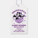 Feminina flickig lila glitter disco boll och en mycket retro ko-mönstrad cowboyhatt går samman för att skapa den perfekta disco cowgirl festliga presentetikett. En holografisk lila, blå och gul akvarell bakgrund inramar den. Denna artikel är en del av Purple Glitter och Cow Pattern kollektionen där du hittar massor av möhippa skrivbordstillbehör och festmaterial.