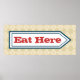 Denna rustika Eat Here skylt är en bra dekoration för alla rum. Designen är från originalkonst.