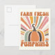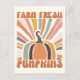 Denna pulserande och återinspirerade falldesign framhäver frasen "Farm Fresh Pumpkins" i fet, lekfull typografi som omedelbart uppmärksammas. I mitten av konstruktionen finns en stor, stiliserad pumpdocka, skild från varma automatiska nyanser av orange, brun och grädde. Pumpan är framtill en dynamisk sprängning av färgstarka strålar som sträcker sig utåt, med en palett med muterade orangar, nyp, och gröntar som ger konstruktionen en nostalgisk vintage. Kombinationen av solsprängningen mönster och det kniviga, fuktiga typsnittet ge är en roligt och en energisk vibe, en perfekt för att fånga den festiva andan av fall.