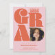 Gradering 2023? Gå stort eller gå hem med våra djärva och överdimensionerade typografinbjudningar! Med ett överdimensionerat Grad-teckensnitt (allt färg är redigerbart) med ett foto i D, och lägg till ytterligare tre foton i baksidan med ett fet överdimensionerat 2023. Orange och rosa.