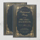 Denna eleganta inbjudan till pensionärsfest har en vintagekänsla med en förgylld ram och eleganta barockdekorationer i guld på en mörkblå läderliknande bakgrund. Tillfället "Pensionärsfest" är skrivet med en elegant kalligrafisk skrift, resten med versaler. All text kan anpassas och har en gyllene färg liknande ramens förgyllda dekorationer.