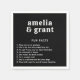 Moderna napkins i stil med enkel och minimal layout med namn i ett upphöjningsteckensnitt tillsammans med en lista med roligtar om bruden och trippen. Färg-schemat är svart med vita bokstäver. Typsnitt / färg kan ändras i designredigeringsverktyget i verktyg. De här roligtarna är napkins som lägger till en roligt inslag till din bröllopsmottagning, förlovningsfest eller möhippa.