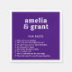 Moderna napkins i stil med enkel och minimal layout med namn i ett upphöjningsteckensnitt tillsammans med en lista med roligtar om bruden och trippen. Det ljusa färg-systemet är ett dynamiskt royalets lila. Typsnitt / färg kan ändras i designredigeringsverktyget i verktyg. De här roligtarna är napkins som lägger till en roligt inslag till din bröllopsmottagning, förlovningsfest eller möhippa.