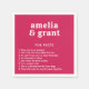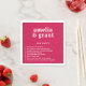 Moderna napkins i stil med enkel och minimal layout med namn i ett upphöjningsteckensnitt tillsammans med en lista med roligtar om bruden och trippen. Det ljusa färg-systemet är en levande Viva-Magentans rosa. Typsnitt / färg kan ändras i designredigeringsverktyget i verktyg. De här roligtarna är napkins som lägger till en roligt inslag till din bröllopsmottagning, förlovningsfest eller möhippa.