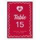 A hand-drawn, bold, and funky wedding table number cards that blends vintage charm with modern flair. The design features a playful red background framed by a wavy red outline, giving it a lively, retro vibe. The typography is fun, funky, and modern, with a nostalgic twist that makes the text pop in soft pink. At the center, a heart motif with a cupid inside adds a whimsical, romantic touch, perfectly balancing elegance with cheeky charm. The overall look is funky yet sophisticated, with a hand-drawn aesthetic that feels both stylish and heartfelt—ideal for couples who want their wedding stationery to radiate personality, joy, and retro-modern love.