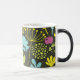 A playful retro-style pattern featuring colorful birds, flowers, and leaves in bright yellow, blue, green, and pink tones on a dark textured background.