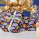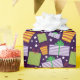 Denna gåva som slår in papper, presenterar ett mönster av gåvor som dras i den retro stilen. De ljusa för grönt, röda och gula färgerna för lilor, är en djärv kontrast mot den mörka purpurfärgade bakgrunden. Mönster betonas med vitstjärnor.