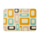 Retro geometric pattern with overlapping rectangles and ovals in orange, teal, pink, and brown on a light beige background, creating a playful, vibrant mood.