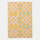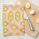 Retro geometric pattern with hexagons and stars in blue, orange, and yellow on a light pink background. The design feels vibrant and nostalgic.