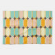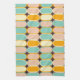 Retro geometric pattern with overlapping vertical ovals in shades of teal, peach, orange, and cream on a dark brown background. Vibrant and symmetrical.