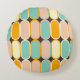 Retro geometric pattern with overlapping vertical ovals in shades of teal, peach, orange, and cream on a dark brown background. Vibrant and symmetrical.