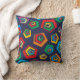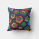 Retro Geometric Vibes Throw Pillow. A lively abstract pattern with colorful triangles and circles in blue, pink, yellow, green, orange, and red on a dark background.