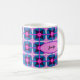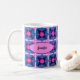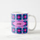 Ett djärvt geometriskt mönster i en fängslande blandning av livfull rosa, lila, blå och en touch av vitt. Kombinerat med en rosa oval form för att lägga till ditt namn, eller annan text, på båda sidor av muggen.