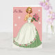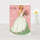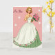 Det här kortet visar en retroinspirerad illustration av en glamourös kvinna i en flytande, ärmlös klänning, med krämigt elfenbensfärgat tyg som flyter över ett mjukt, salviagrönt lager för en mjuk, romantisk look ❤️. Ett pärlbesatt midjeband framhäver hennes figur, och klänningens kant är dekorerad med små rosa rosor och gröna blad som känns som en söt gåva som ges med omsorg. Hennes gyllene hår är format i mjuka vågor runt ett leende ansikte med ljusa blå ögon och rosiga kinder, som om hon delar en kärleksfull, uppskattande blick med någon strax intill. I sin vänstra hand håller hon en bukett med fem fylliga rosa rosor, medan hennes högra hand vilar lätt på hennes bröst i en öm "tack"-gest. Bakgrunden är pastellrosa med spridda, vita stjärnformade figurer och små prickar som liknar fladdrande glitter, vilket ger en drömsk, tillgiven atmosfär 🌼.