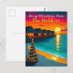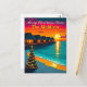 En festlig retro vykort med en tropisk Maldiverna jul med villor över vatten, ett dekorerat julgran, och en varm gyllene solnedgång. Perfekt för att skicka julhälsningar från paradiset.