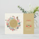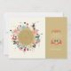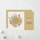 Tan- och ljusbeige bakgrund med färgstark retro-christmas-design. Beige cirklar snöre med färgstarka julklackssymboler, blommor, hjärtan på ena halvan. God jul med rött hjort i vitt och tam Anpassade namn.