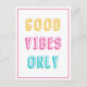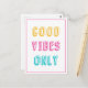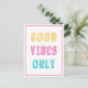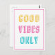 Ett inspirerande vykort med bekräftelsen "endast goda vibes". Varm och upplyft. Den färgstarka typografiska designen har funktioner som återger 3D-text.