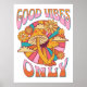 En modell i stil som bara säger Good Vibes och som har 1960-talets tittar svampar och blommor