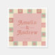 Den djärva korallkonstruktionen för rosa bröllop napkin omfattar ett 70-talsmoment med vibrerande blommigtar parade med en rosa återincheckad gräns. Perfekt för par som kärlek vintage charm med en modern tvist och perfekt för återinspirerat, boho eller sommartid i bröllop. Utforska matchande objekt i vår bröllop-svit för att slutföra utseendet!