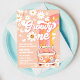 Fira din lilla enas speciella dag med denna retroinspirerade födelsedagsinbjudan med en persikofärgad bakgrund, vita prästkragar, fjärilar, hjärtan och en regnbåge i varma nyanser av orange, rosa och gul. En blombeklädd skåpbil med en fredssymbol ger en rolig hippievibbar, perfekt för en funky första födelsedagsfest. Denna anpassningsbara inbjudan blandar nostalgisk 1960-talsstil med modern charm, vilket gör den idealisk för barnkalas, freds- och kärleksteman eller retrodekor. Anpassa enkelt för ditt barns namn, datum och detaljer för att skapa en unik souvenir.