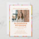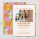 Denna inbjudan till examensfest har en djärv, retroinspirerad geometrisk ram i korall, rosa, senap, salvia och ljusblå som omger ett centrerat fönster för foto och djärv, grotesk namnstypografi. Den färgrika 70-talsinspirerade designen ger en rolig, festlig energi som känns fräsch och full av personlighet. Perfekt för den som vill ha något livfullt och glädjefyllt för att fira examen. All text och foto är helt redigerbara för att anpassas med din examinaands namn, skola, examensår, datum och evenemangsinformation.