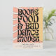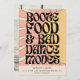 Lustigt bröllop spara datum-kort i en 70-inspirerad design som lyder: Sprit, mat och dålig dans rör sig. Lägg till informationen om bröllop på framsidan och fotot på baksidan.