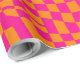 Get your groove on with this funky, psychedelic wrapping paper! The design features a classic checkerboard pattern that has been warped and distorted into a liquid, wavy optical illusion. Rendered in a bold, high-contrast color palette of bright hot pink (fuchsia) and tangerine orange, this design screams energy.
