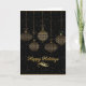 Glad helg hälsningskort. Vita gnistor, svart bakgrund och retro guld tines christmas-prydnadsämnen.