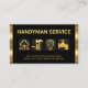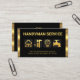 Ett svart hölje är inkapslat av guld rand vid kortets ytterkant. Den har fyra guld-ikoner för kreativ som kan representera en del av det arbete du utför, t.ex. guld träd för landskapsvård-, hammarborste för omformning av hemmet, elverkets lampa och rörmokaren. ; Varje ikons använda lämnas enligt er egen tolkning. Över överst är namn med ett sloganalternativ och kontaktuppgifter nära basen. ; Du kan ändra textanmärkningarna till slagordet till kostym för dina egna tjänstebehov. På andra sidan används samma guld-strimlade utformning som höljet. Överst finns en "home handyman verktyg"-logotyp som du kan använda följt av ditt prestigefyllda namn, kontaktinformationen och ett sloganalternativ för att publicera dina tjänster. Alla bokstäver är i Faux guld. En underbar utformning för handymans- och byggnadsteman.