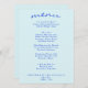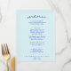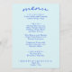En färglös funky, modern, smart bröllop-middagsmeny. Med chic av boho vintage himlar blå bakgrund och blå typografi och handskriven meny i blått och hand plockade biet av kaka, glas, blomma och ljus. Och gröntens ljusa bakgrund. Perfekt och matchning med hela sviten.