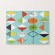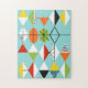 Detta Retro Harlequinmönsterpussel är modern stil för mitt- århundrade på dess mest fin. Den vintage inspirerade designen presenterar en aquabakgrund med ror av triangulärt formar att bilda ett harlequinmönster. Dentonade diamanten formar är gul, vit, rött som är orange, svärtar, görar grön, och vit med svart brytningar. Men väntan, där är mer! Det finns också orange ovaler, grön ovaler med svart starbursts och skisserar av svart diamanter. Time marscherar på, men du ska känselförnimmelsenågot liknande som du har funnit en kitschy tryckvåg från förflutnan med denna färgrika geometriska skatt.
