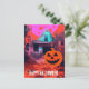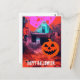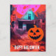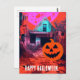 Retro Haunted Halloween House Rosa Orange Blue Vykort