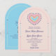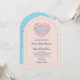 Fira din kärlek med denna livfulla retroinspirerade välvda bröllopsinbjudan med en lagerpå-lager-regnbågshjärndesign i djärka rosa, blå och gula nyanser. Framsidan sätter en lekfull och glad ton medan baksidan innehåller en anpassad QR-kod för RSVP på en ljusblå bakgrund för enkel gästsvar. Perfekt för par som planerar en rolig, färgglad fest eller ett 70-talsbröllop med en modern twist. Fullt redigerbar och idealisk för sommarbröllop med personlighet.